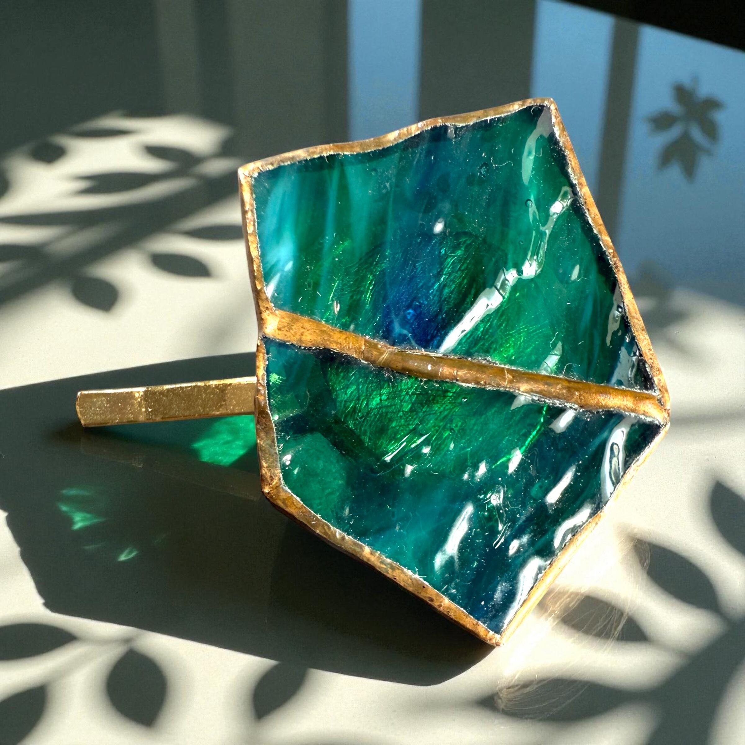 青からグリーンへと静かに溶け合う色彩が、深い海の中を思わせるガラスのポニーフック。