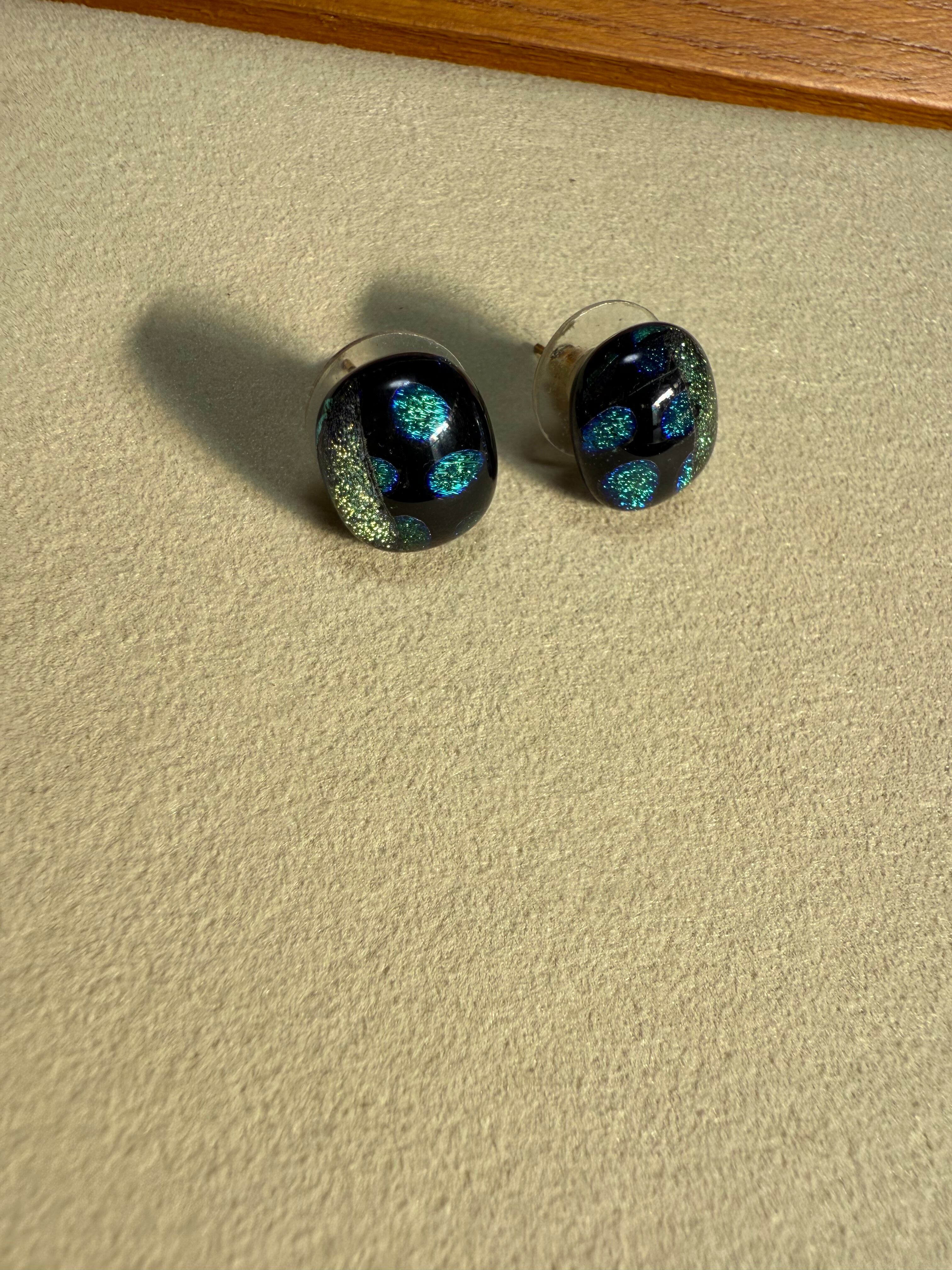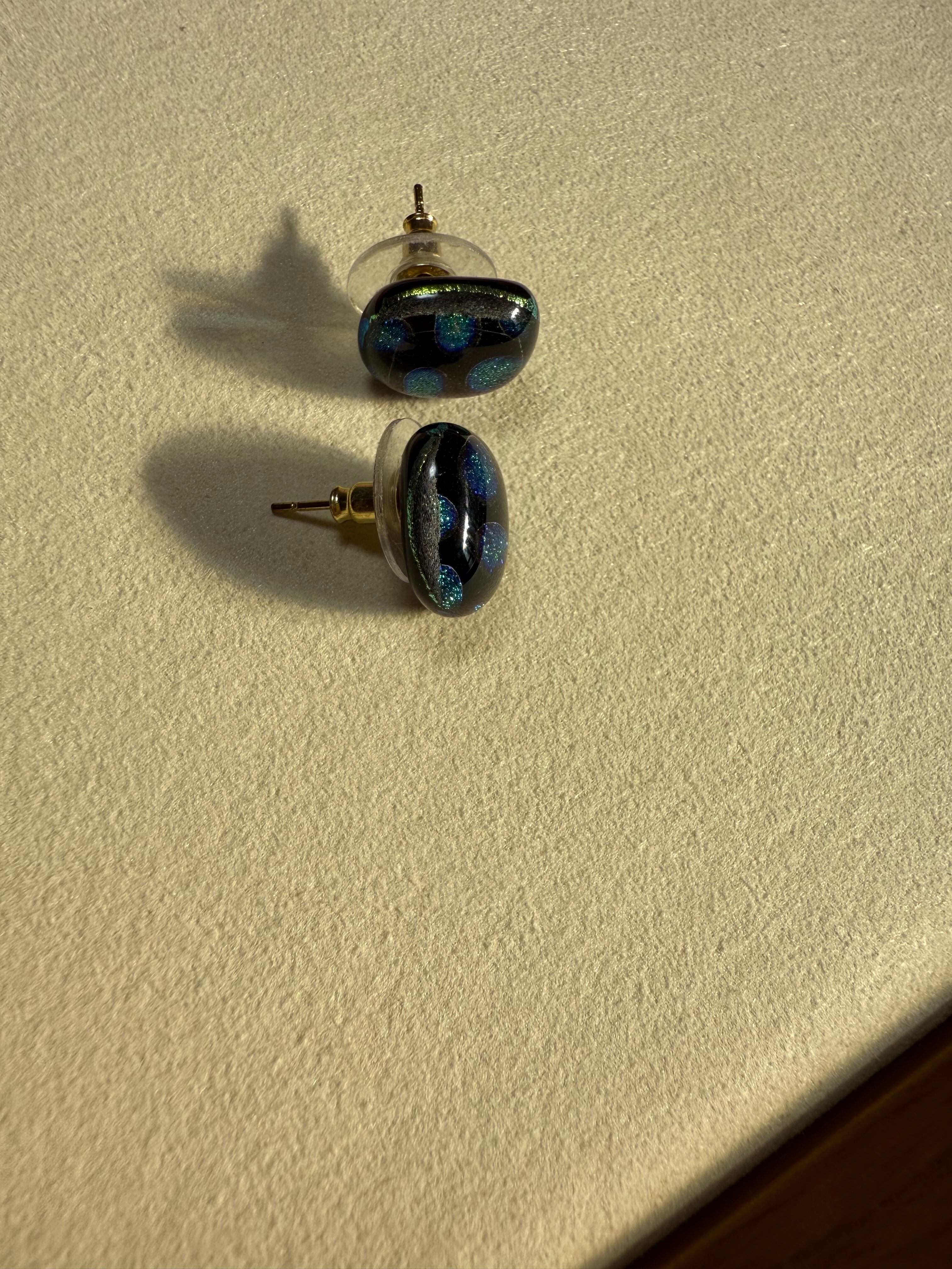 深いブラックガラスの中に、青とグリーンの光が浮かび上がるアートのようなピアス。