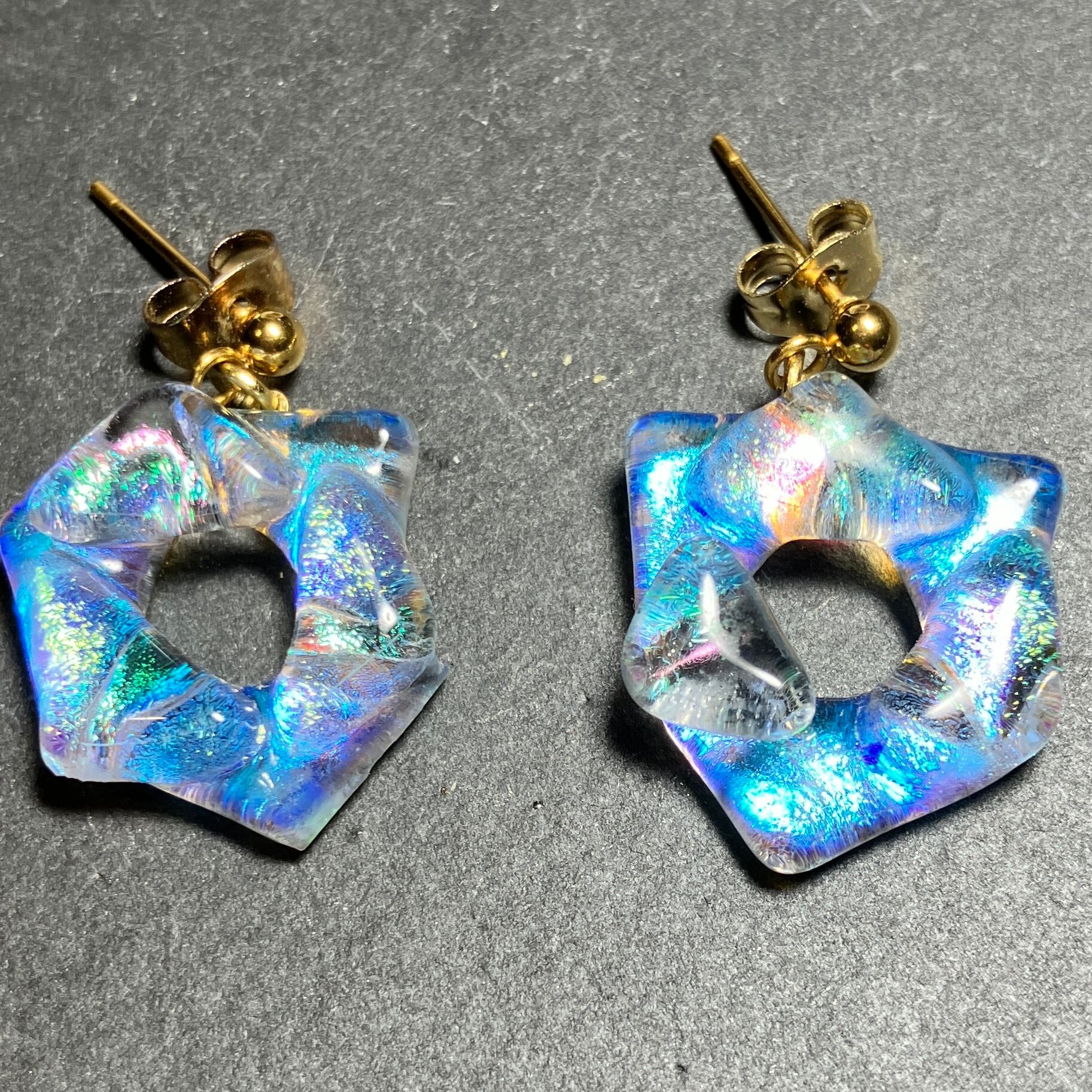 オーロラに光るガラスを小さく三角形にカットし、重ね合わせて焼き上げました