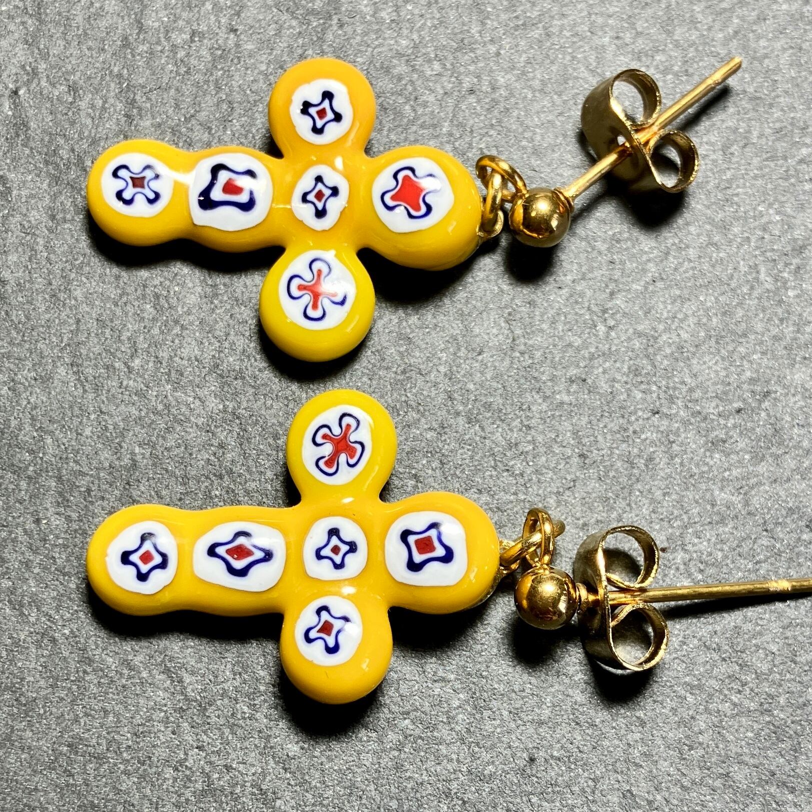 ベネチアンガラスのミルフィオリを十字架の形に並べて、焼いて仕上げました。