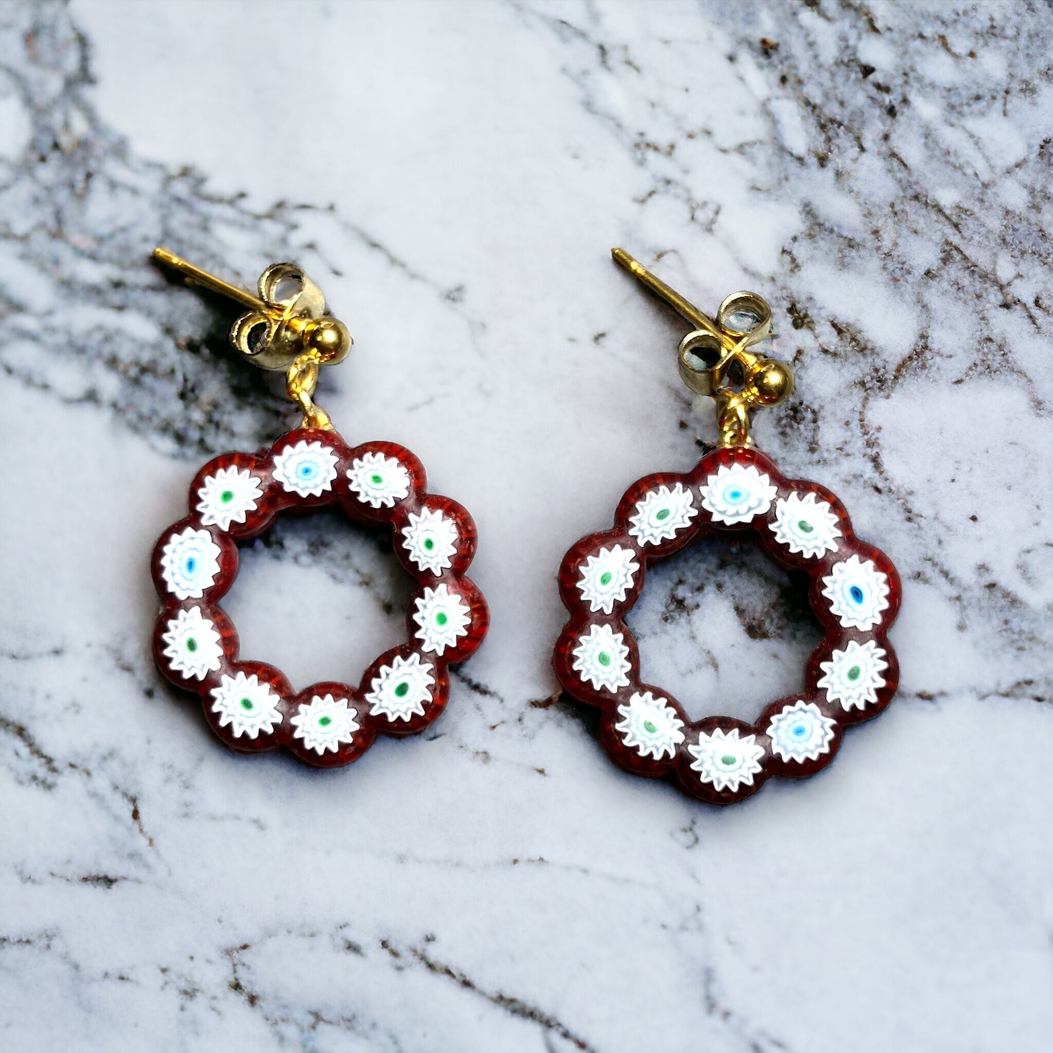ベネチアンガラスのミルフィオリを丸く並べてドーナツのように焼いて形にしました。