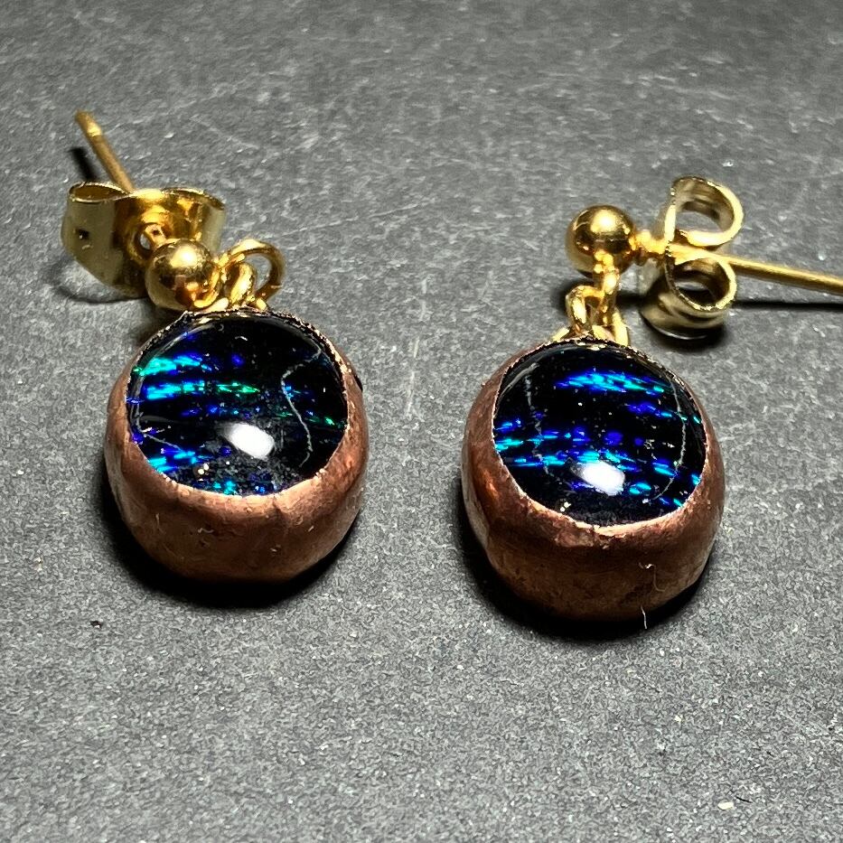 黒のガラスの上にオーロラに光る模様が入ったクリアガラスをのせて焼き上げた後に、形を整えてステンドグラスの手法でハンダ仕上げにしました。ゴールドのパーツと合うように、ハンダもアンティーク仕上げにしてあります。