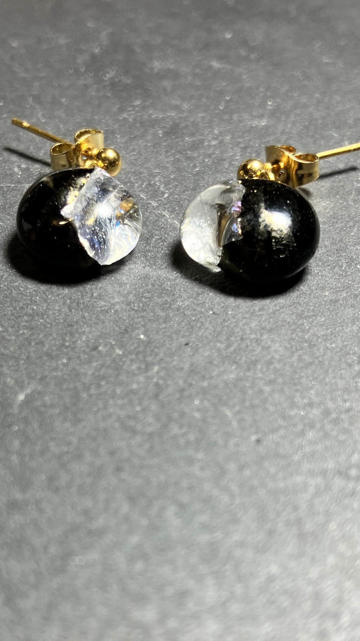 黒っぽい玉虫色のガラスとオーロラに光るガラスを組み合わせて焼き上げました。
