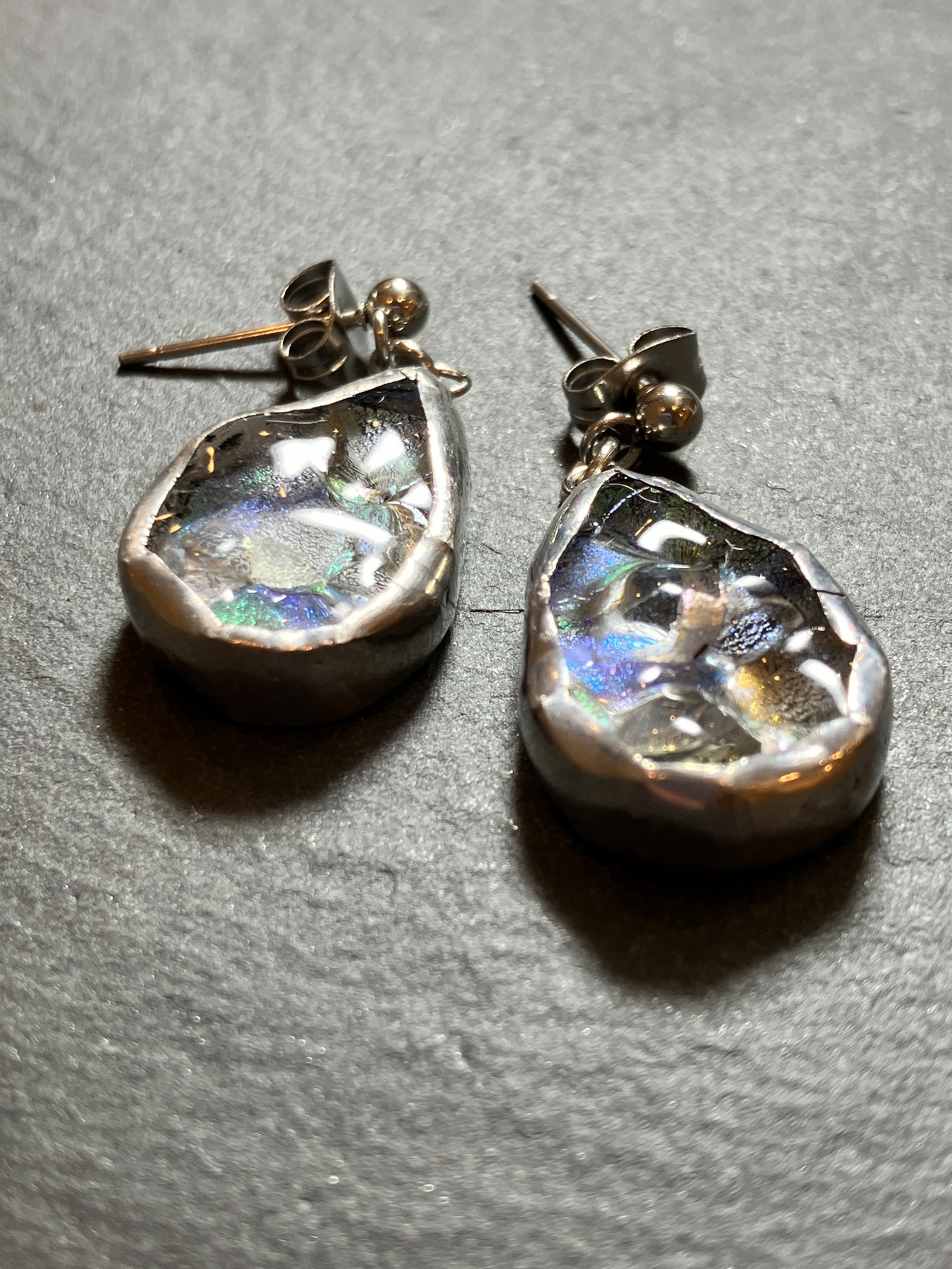 細かくカットしたダイクロガラスを組み合わせて焼き上げて、ティアドロップの形に整えました。