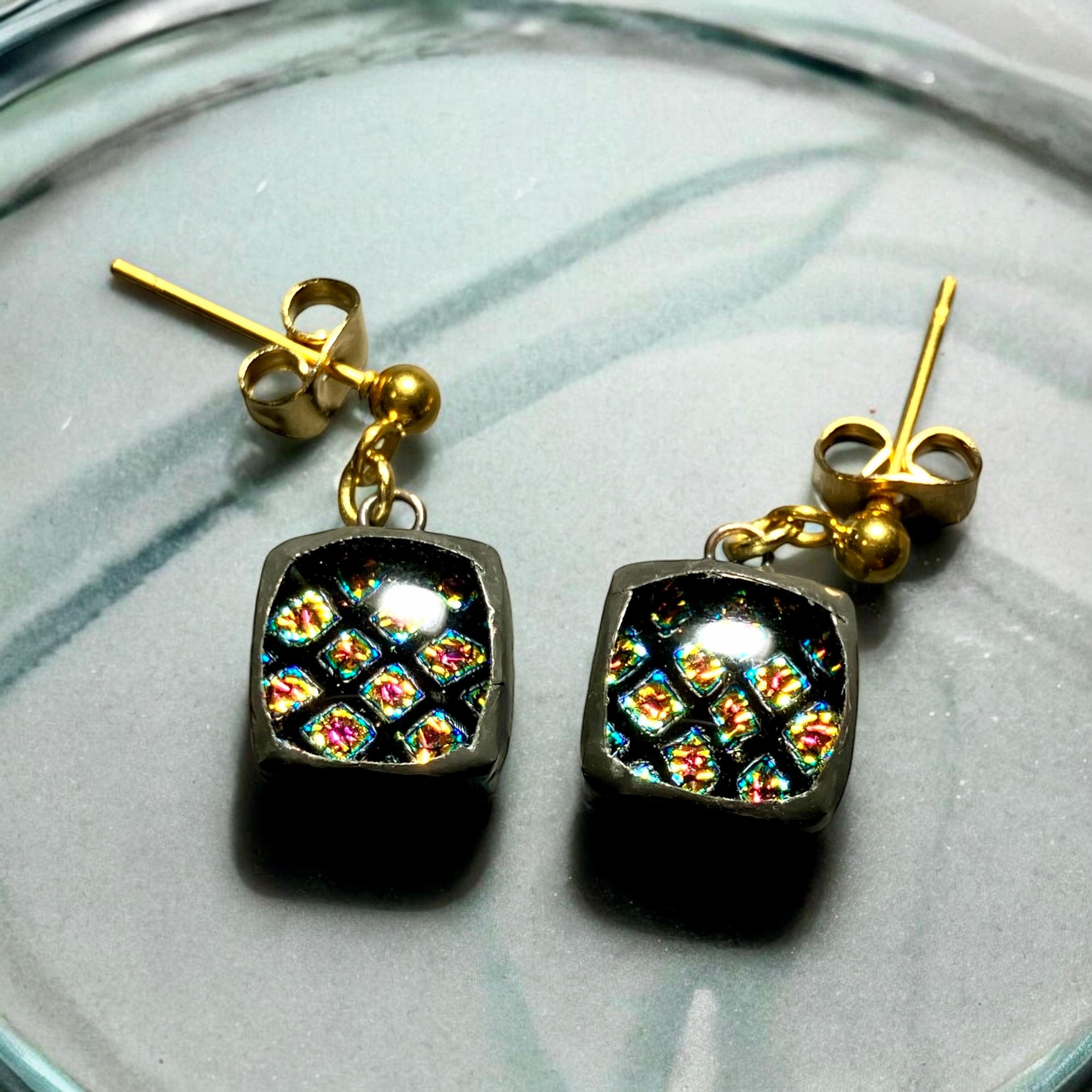 ダイクロと透明ガラスを合わせて焼き上げて四角に形を整え、