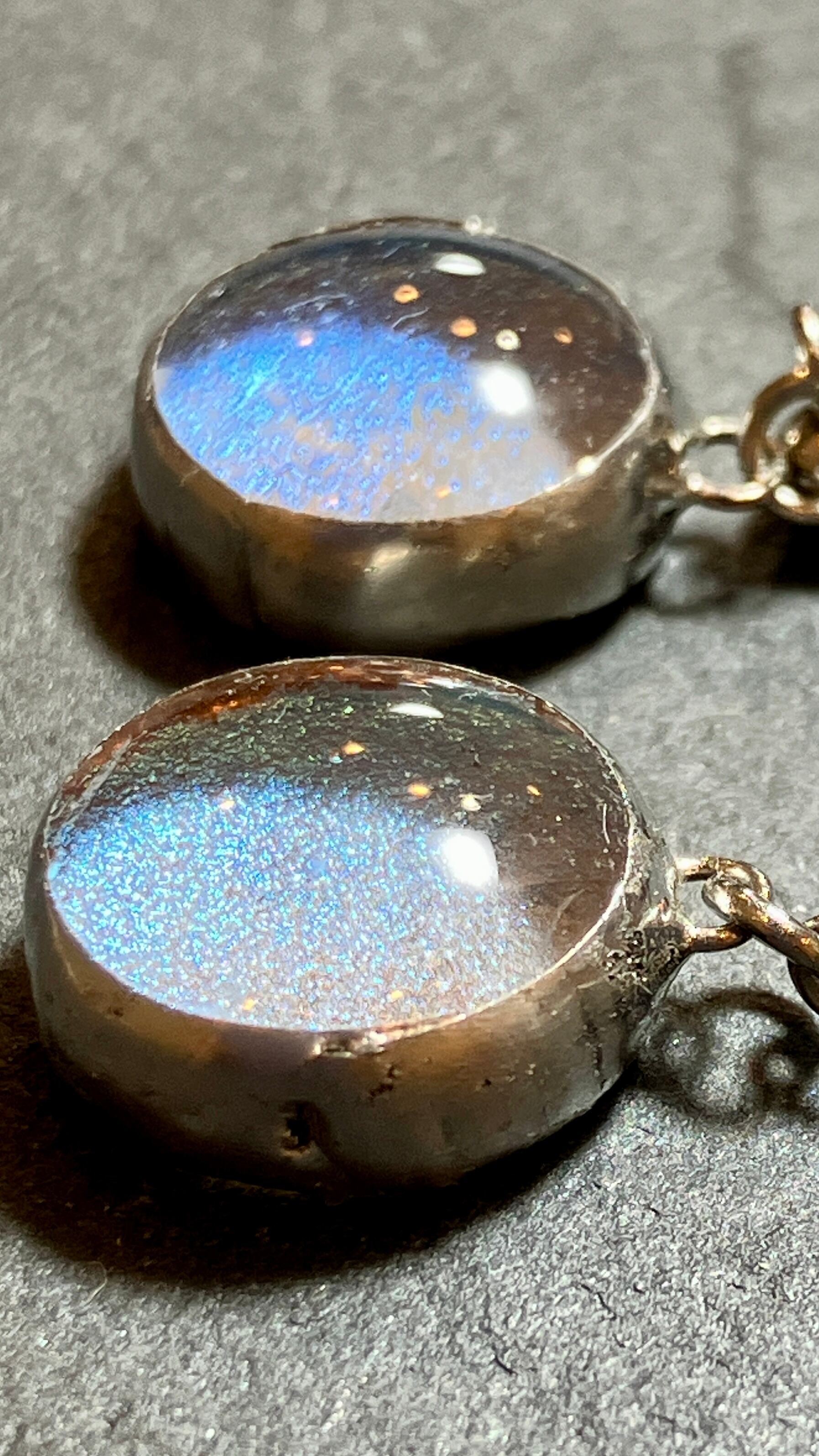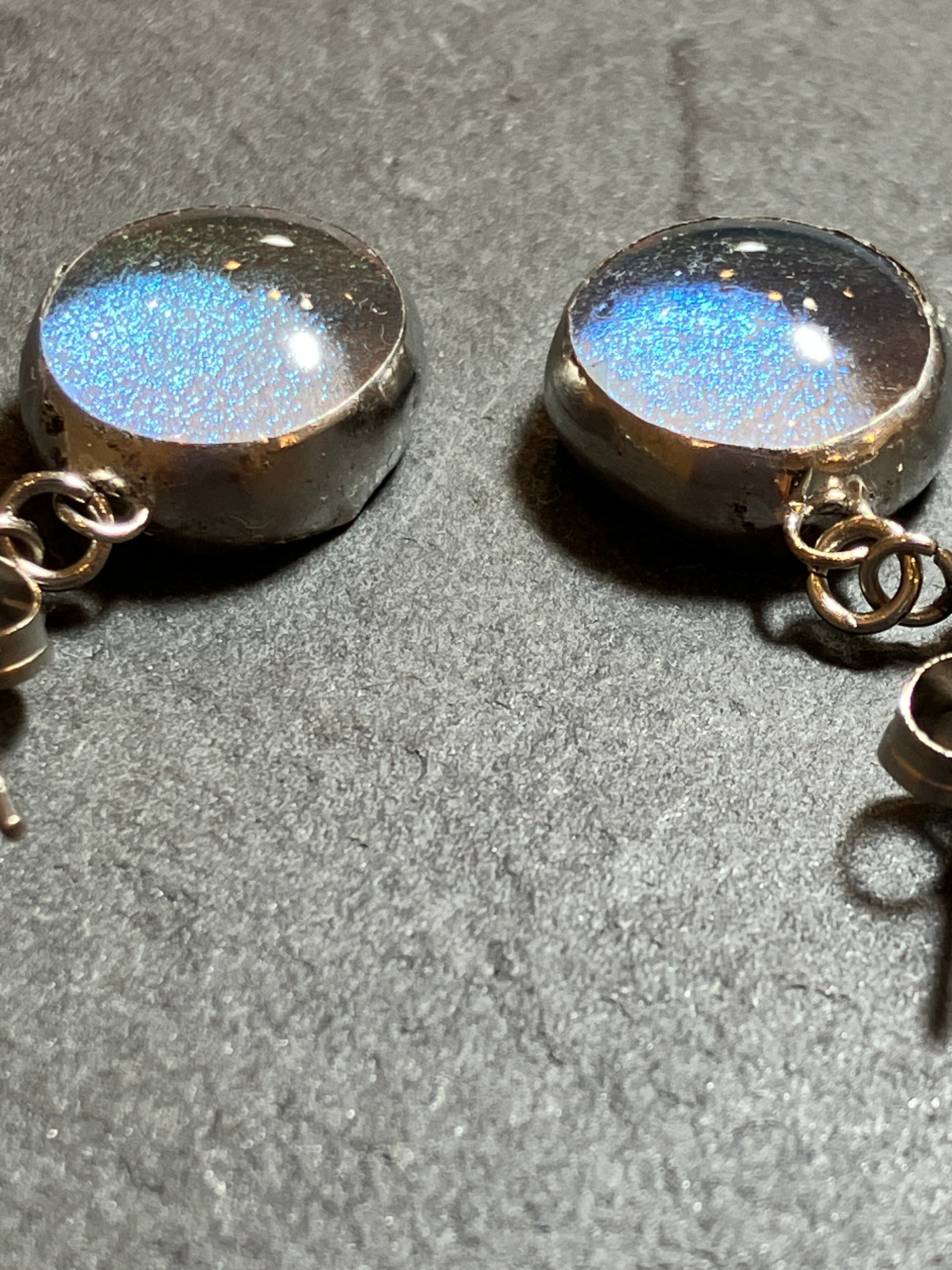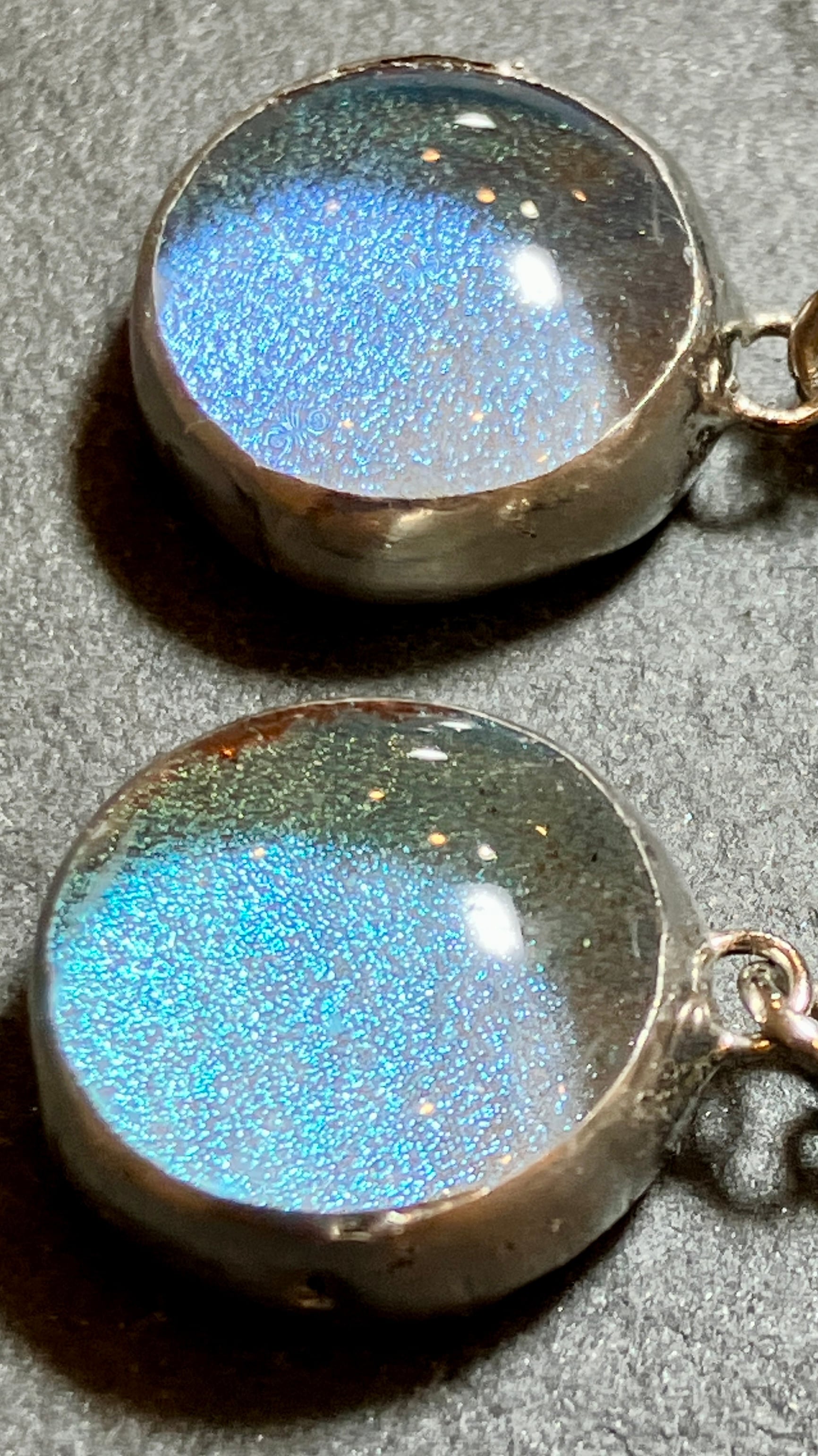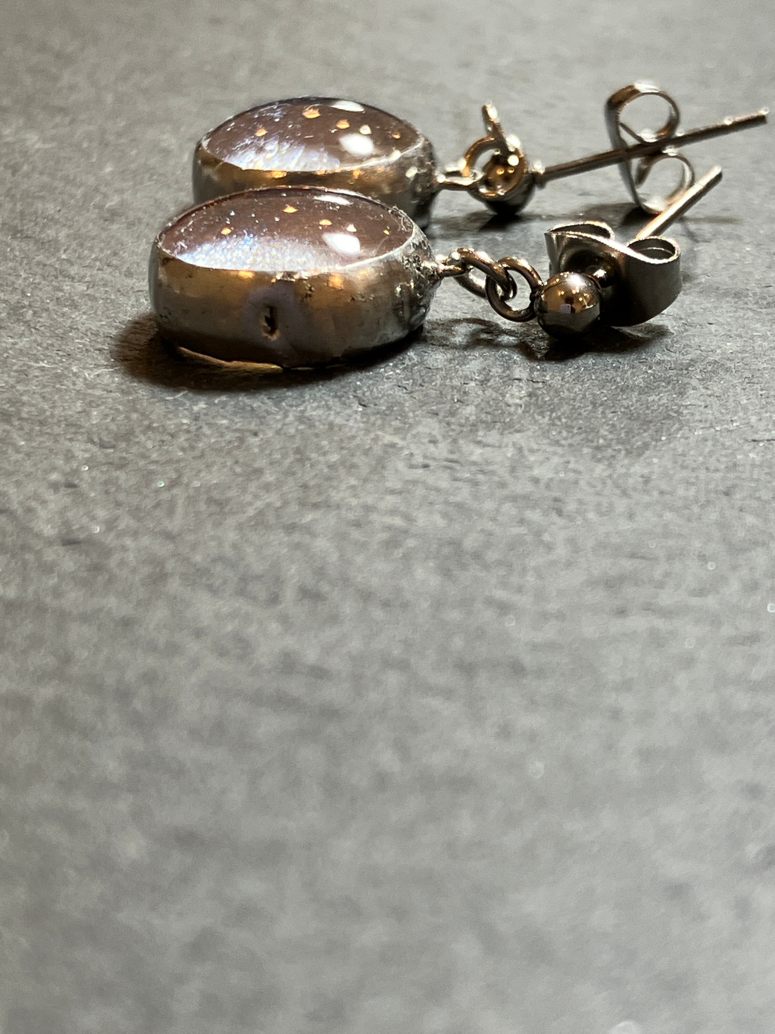 ダイクロと透明ガラスを合わせて焼き上げて丸く形を整えて、ハンダ仕上げにしました。
